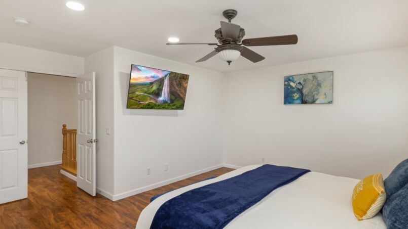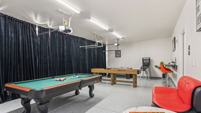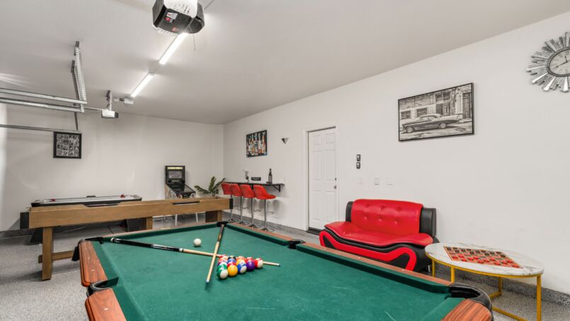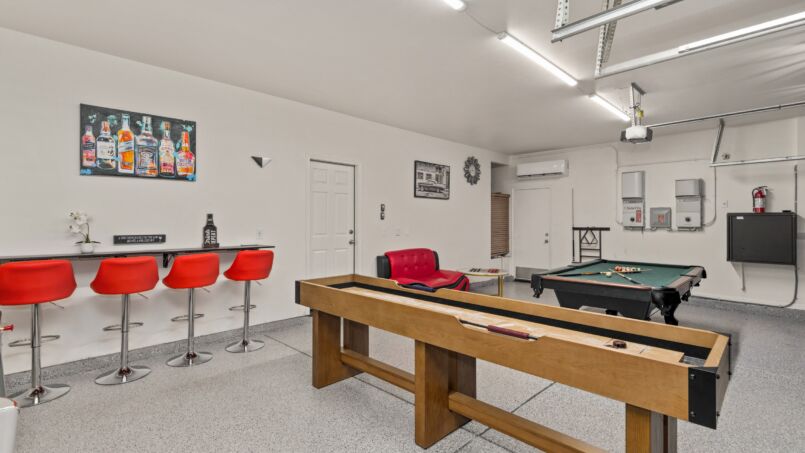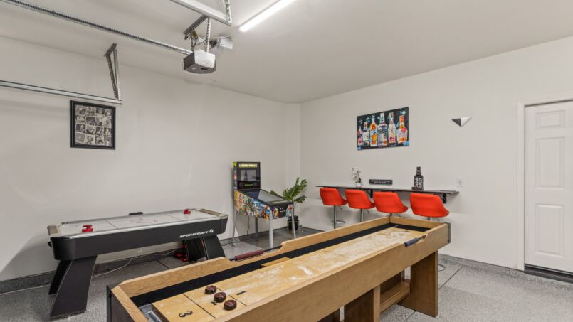 The fully equipped kitchen is a chef’s dream, complete with high-end appliances, granite countertops, and everything you need to prepare delicious meals for your group. The dining area offers ample seating for all, perfect for enjoying family meals or hosting dinner parties. The living room is comfortable and inviting, featuring a cozy fireplace and plush seating for everyone to gather and relax.